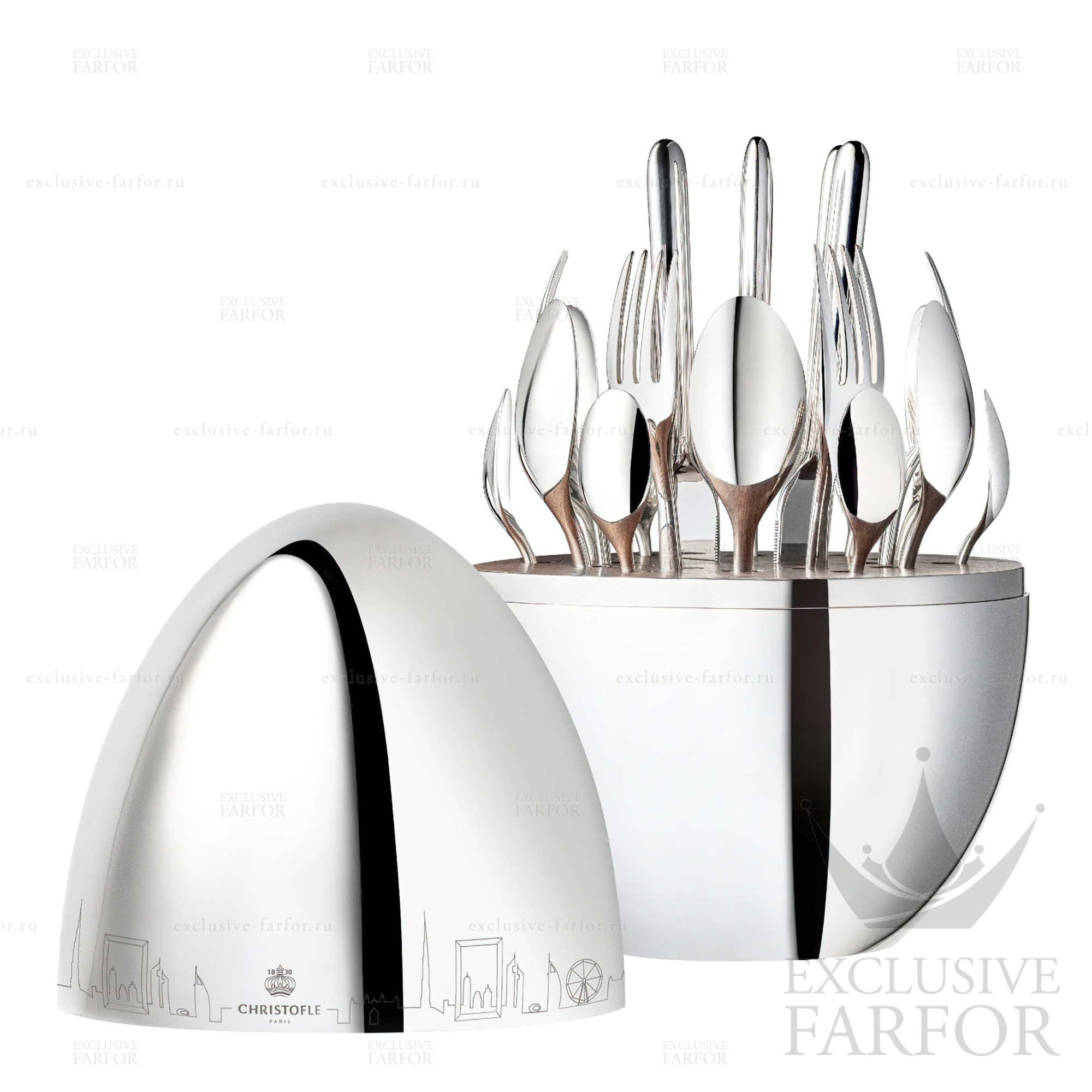 Артикул ch-00065312 Страна производителя Франция Брэнд Christofle Форм/Декор Mood Skyline "Посеребрение" Материал Посеребрение Размер/Обьём 24 предмета Вес Серебра Не применимо - Отзывы